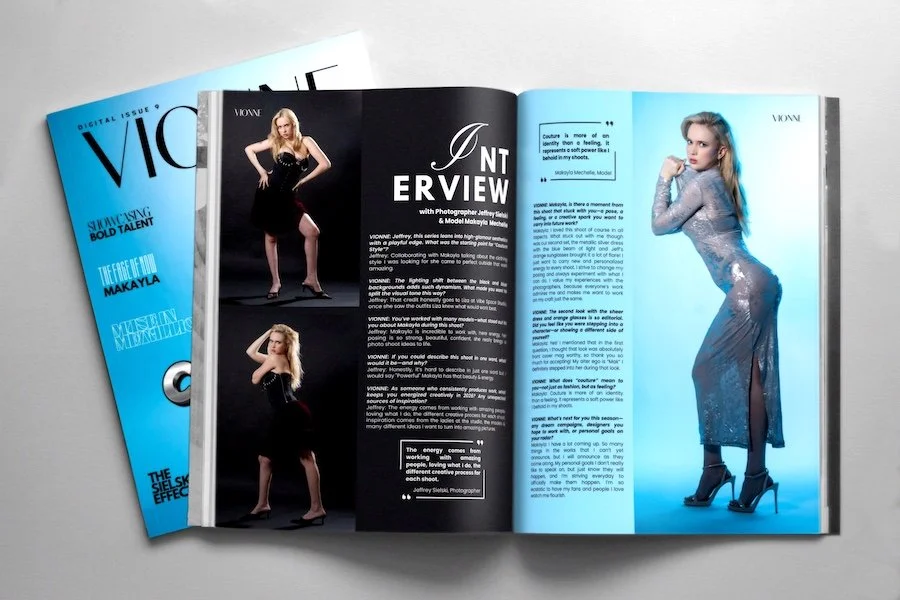In his latest editorial Couture Style, photographer Jeffrey Sielski turns Manhattan’s Vibe Space Studio into a dual-stage of drama and shine. Set against stark black and icy blue backdrops, the series shifts between bold glamour and futuristic edge—each frame powered by the magnetic presence of model Makayla Mechelle (Alice Laura Models). Styled in velvet corsetry and liquid-metal silhouettes, Makayla transforms with each look, exuding couture confidence and a dash of rebellion.