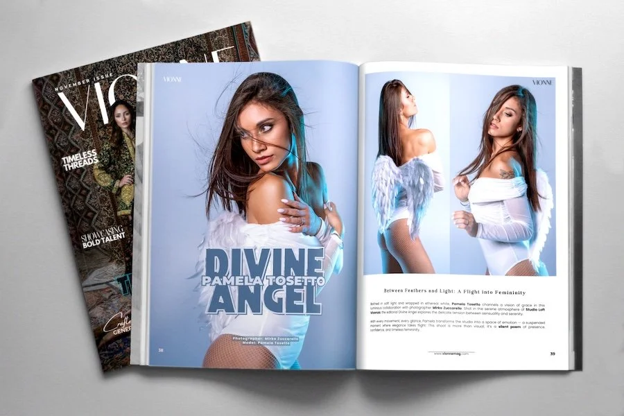Bathed in soft light and wrapped in ethereal white, Pamela Tosetto channels a vision of grace in this luminous collaboration with photographer Mirko Zuccarello. Shot in the serene atmosphere of Studio Loft Vicenza, the editorial Divine Angel explores the delicate tension between sensuality and serenity. With every movement, every glance, Pamela transforms the studio into a space of emotion — a suspended moment where elegance takes flight. This shoot is more than visual; it’s a silent poem of presence, confidence, and timeless femininity.