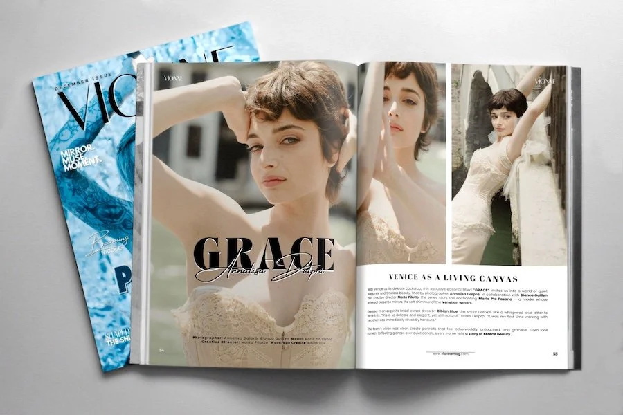 With Venice as its delicate backdrop, this exclusive editorial titled “GRACE” invites us into a world of quiet elegance and timeless beauty. Shot by photographer Annalisa Dalprà, in collaboration with Blanca Guillen and creative director Marta Pilotto, the series stars the enchanting Maria Pia Fasano — a model whose ethereal presence mirrors the soft shimmer of the Venetian waters.