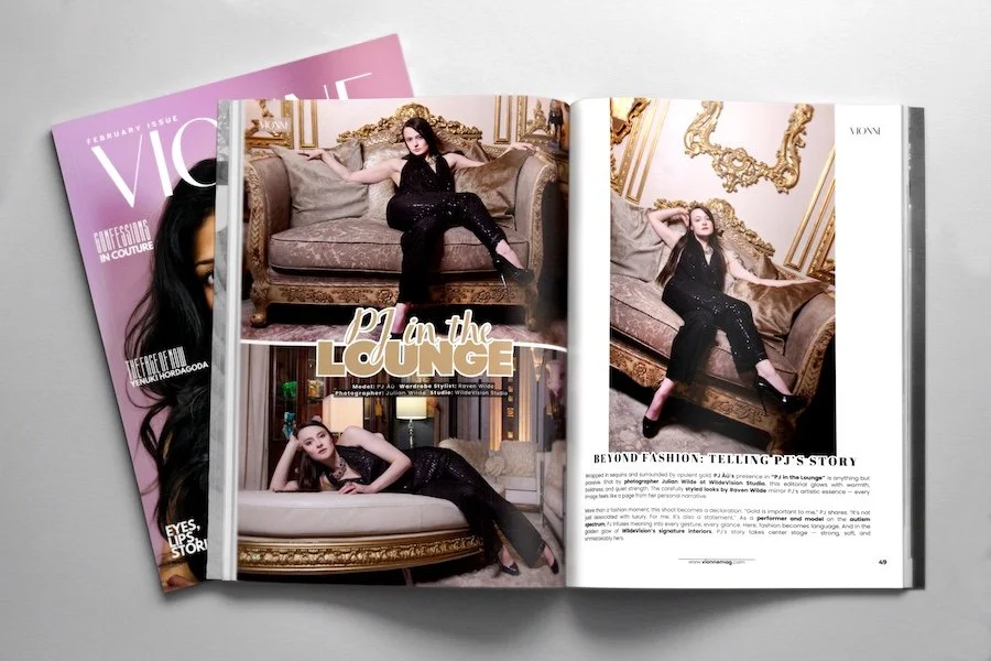 Wrapped in sequins and surrounded by opulent gold, PJ Âû’s presence in “PJ in the Lounge” is anything but passive. Shot by photographer Julian Wilde at WildeVision Studio, this editorial glows with warmth, boldness, and quiet strength. The carefully styled looks by Raven Wilde mirror PJ’s artistic essence — every image feels like a page from her personal narrative.