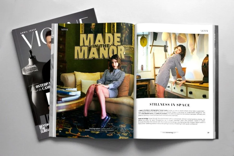 In Made in the Manor, photographer Forest Lewis invites us into a world where time feels suspended—where heritage interiors and quiet moments of solitude shape a narrative of understated elegance. Set within richly detailed rooms and softly lit corridors, the editorial explores the tension between stillness and presence, capturing a mood that feels both intimate and cinematic.