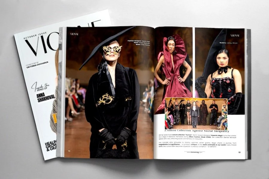 With her newest haute couture collection “Human”, Berlin-based designer Yasemin Akgül turns the runway into a stage of resistance. Premiered during Milan Fashion Week S/S26, the collection blends Baroque splendor with a raw, unflinching social commentary on inequality. From minimalist white silhouettes to lavishly adorned velvet gowns, Akgül charts a journey from marginalization to magnificence — a symbolic critique of the stark contrasts in our world. Every thread speaks. Every curve of fabric becomes a question. Is beauty complicit — or defiant?